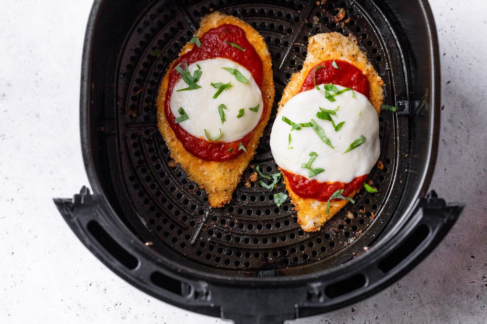 Prime It. Flip the rooster and add the tomato sauce and mozzarella. Air fry 3 minutes extra to soften the cheese and to get the inner temperature to succeed in 165ºF. (If you might want to prepare dinner in batches, you possibly can pop the completed rooster in a 200ºF oven to maintain it heat.)