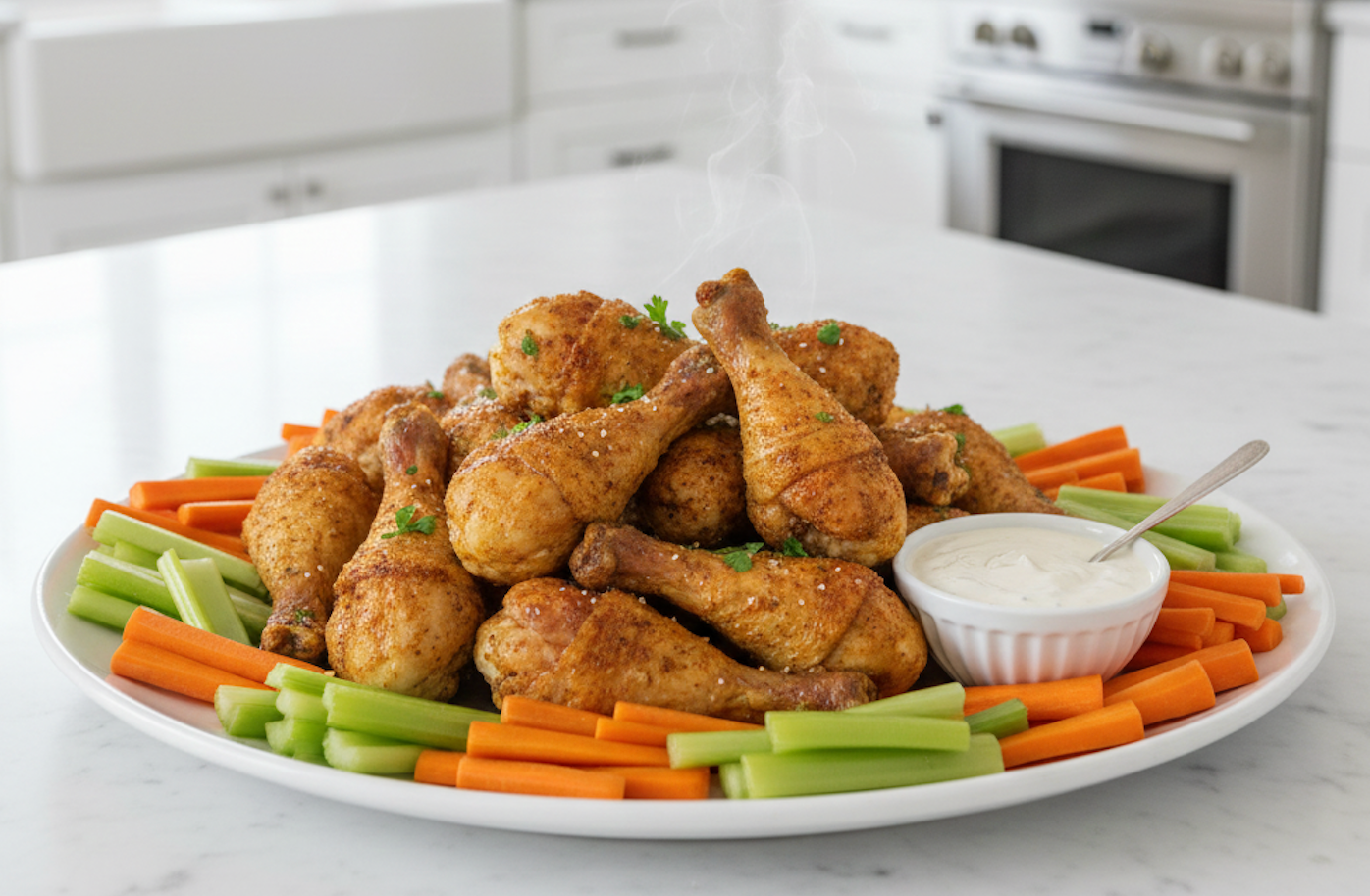 a plate of chicken drumsticks on a white kitchen counter with a bowl of ranch dressing and carrot and celery sticks