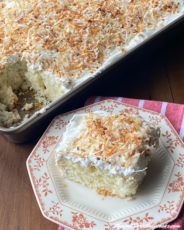 As soon as cooled, unfold the complete container of cool whip excessive of the cake. Unfold toasted coconut excessive of the cool whip.