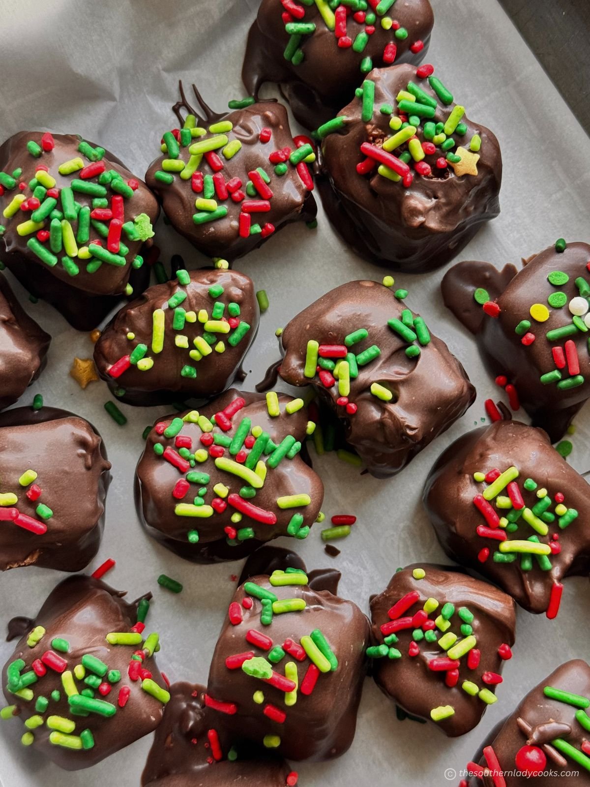 You don’t have to chop these into squares; you’ll be able to drop them by spoonfuls onto parchment paper, put them within the fridge, after which dip them. The chocolate hardens very quick, so in the event you plan to embellish them, add sprinkles proper after dipping them.
