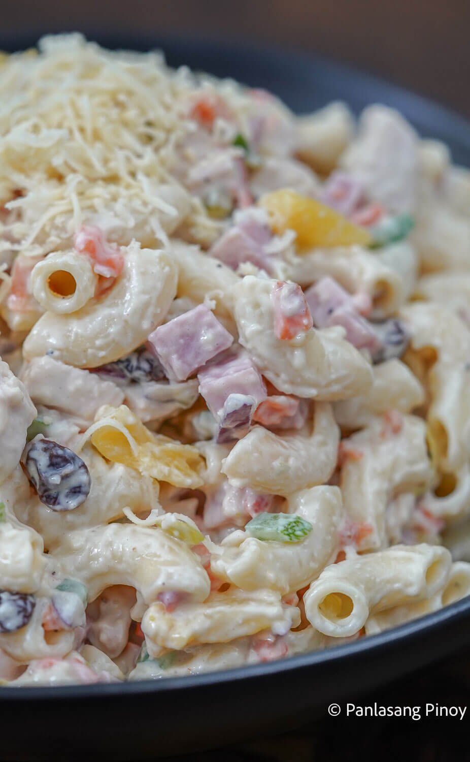 Creamy Filipino type macaroni salad made with rooster, ham, fruits, greens, and a wealthy mayonnaise and cream dressing.
