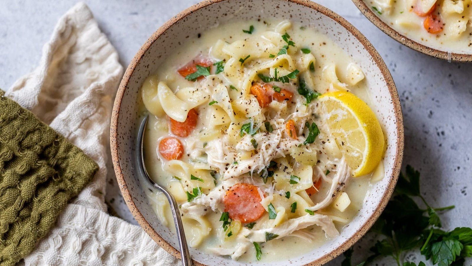 A bowl of creamy turkey noodle soup with carrots, parsley, a lemon wedge, and a spoon on the side.