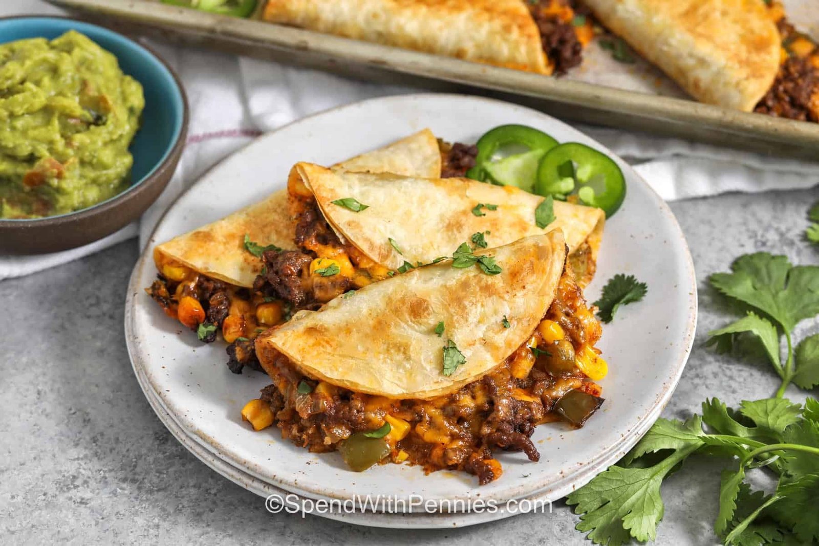 Brush one facet of every tortilla with olive oil, then flip them so the oiled facet is down. Divide the seasoned beef combination and cheese onto one half of every tortilla and fold it over.