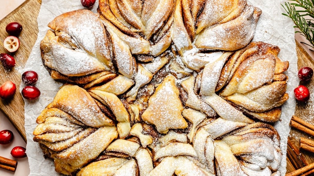 We’re truly utilizing the whole lot in my well-known cinnamon roll recipe and easily shaping it right into a snowflake! Right here’s what you’ll want: