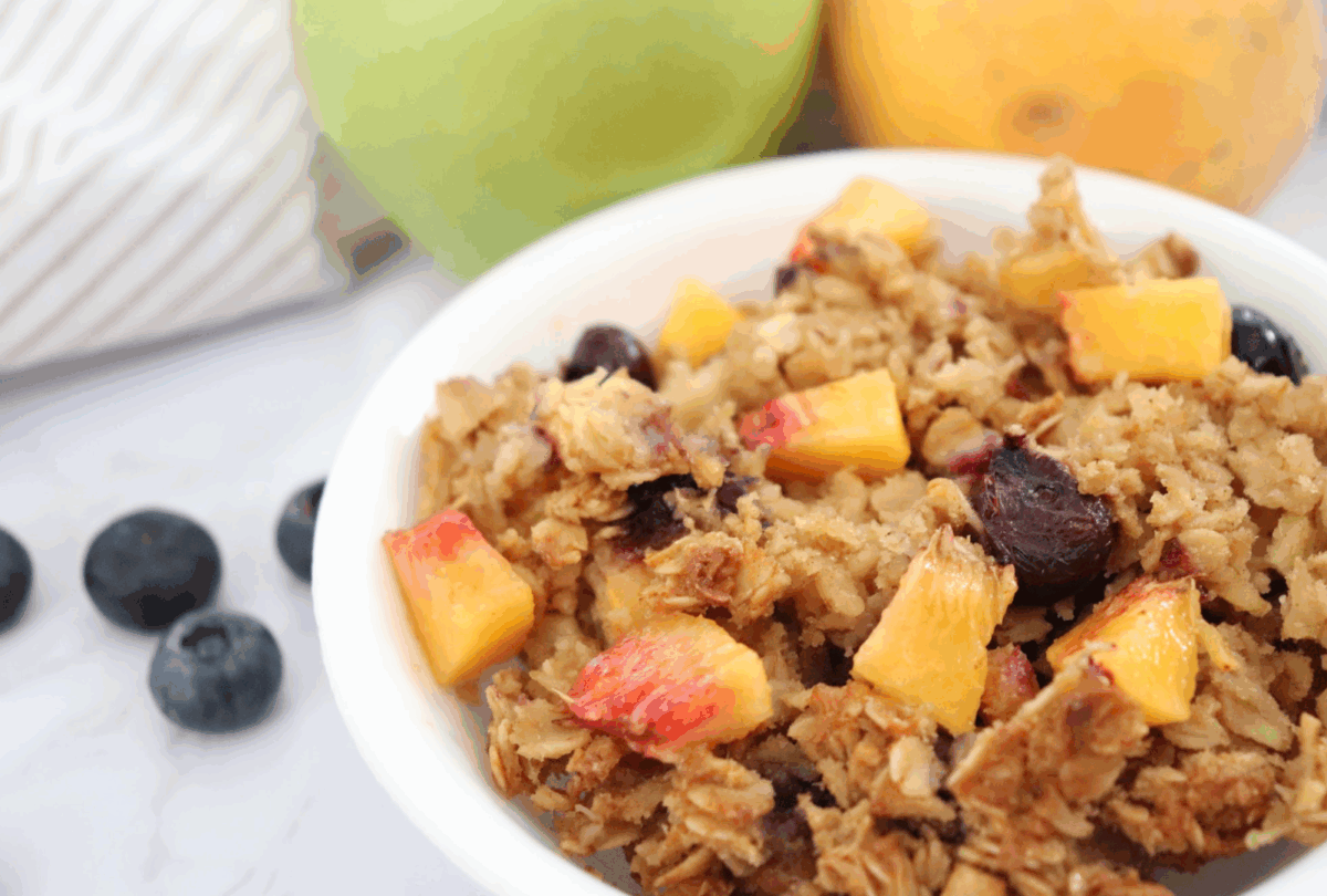Preheat the oven to 350 levels. In a big bowl, mix the oats, brown sugar, baking powder, salt and cinnamon. Cube the apples and peaches.