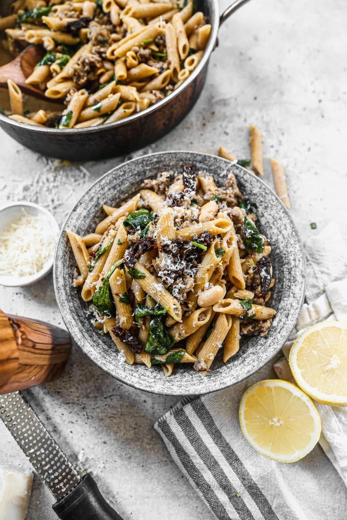 This simple Italian Sausage Pasta brings all the flavour with sausage, sun-dried tomatoes, garlic, and a shiny, buttery lemon sauce, together with white beans and spinach to make it additional filling. Mangia!