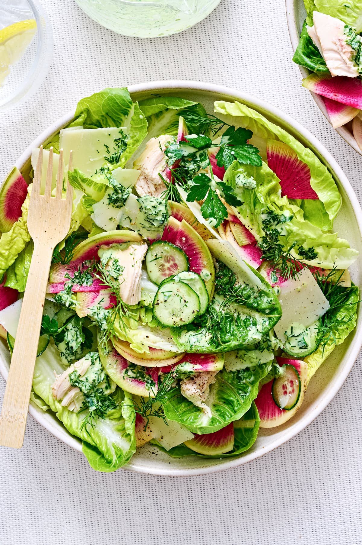 - Make the salad: Add the romaine to a big bowl and high with rooster, cucumbers, and radishes. Drizzle with the dressing, and garnish with herbs, Parm, and black pepper.
