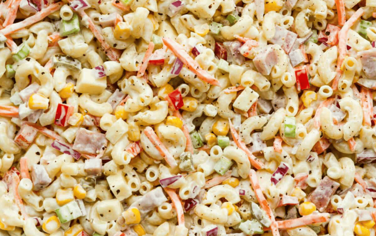 - Mix: To the bowl of pasta, add diced ham, corn, shredded carrots, diced bell pepper, Monterey jack cheese, diced celery, diced crimson onion, and chopped pickled jalapeño.