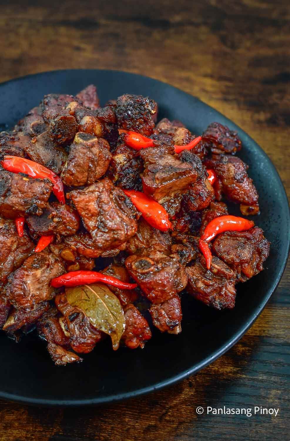 Tender pork ribs simmered in a savory spicy adobo sauce with soy sauce, vinegar, chili, and aromatics for a daring flavorful meal.