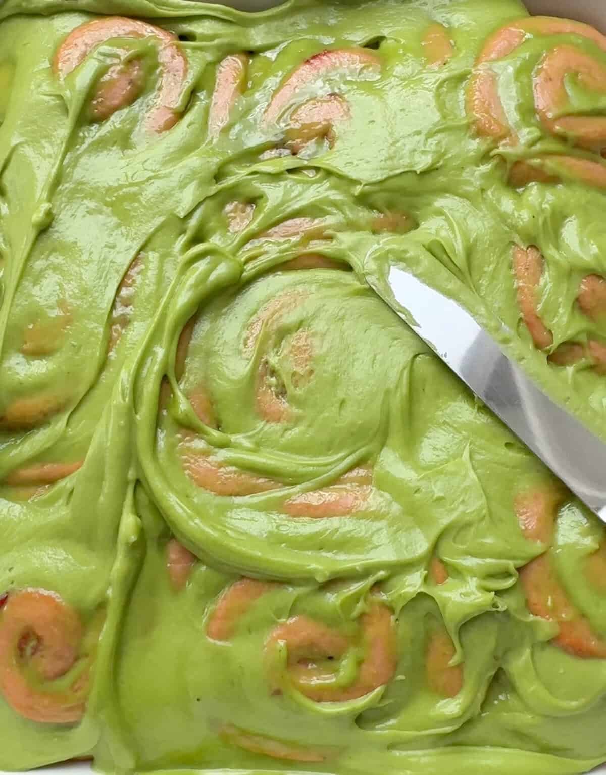 • Whereas the rolls are baking, make the frosting by beating collectively the cream cheese and butter till easy with a hand or stand mixer. Add the powdered sugar, matcha and pinch of salt. Combine till mixed.