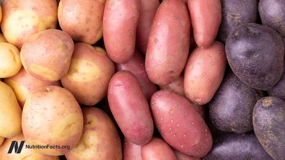 Purple potatoes can enhance the antioxidant capability of our bloodstream, whereas straight white potato starch can act as a pro-oxidant and reduce it. Eat a purple potato, and, over the following eight hours, the antioxidant capability of your bloodstream goes up. In distinction, for those who eat white potato starch devoid of any pigment, you may find yourself worse off than the place you began, as you may see under and at 4:12 in my video.